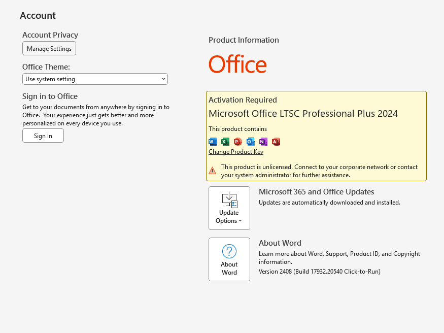 - Once installed, open Word, click Account and then click “Change Product Key”